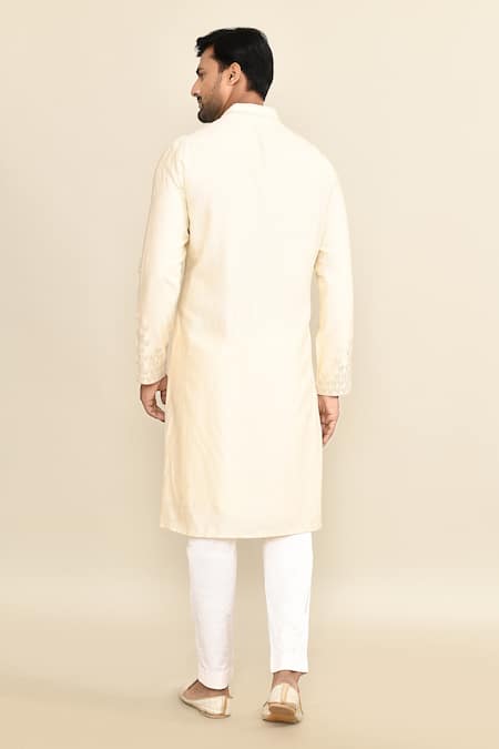 Ivory kurta featuring geometric embroidery with sequins and cutdana. Paired with matching white pant for a complete look.