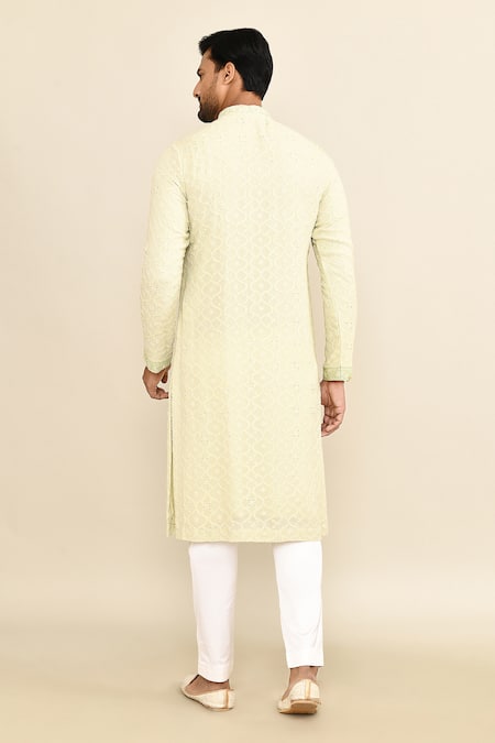 Mint green kurta featuring Lucknowi embroidery with cutdana and sequins. Paired with ivory color pant for a complete set.