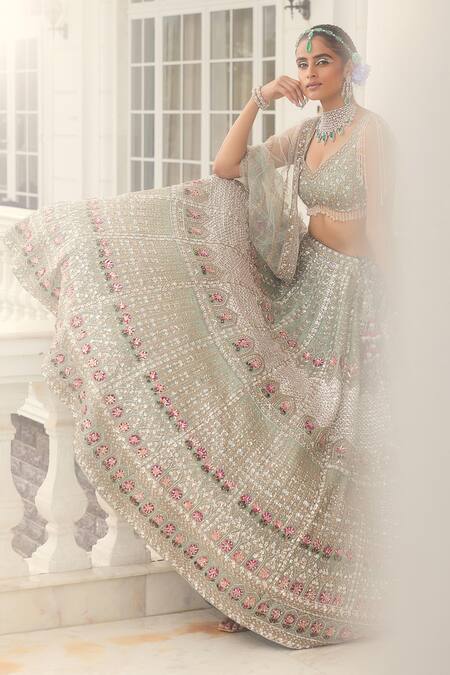 Dusty firozi lehenga featuring all-over floral vintage pattern with sequin, contrast velvet applique & cut dana embroidery. Paired with a floral embroidered padded blouse and a net dupatta with scalloped cut work embroidered border.