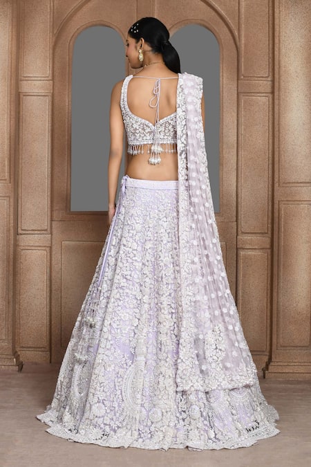 Lilac lehenga featuring an all-over floral vintage jaal pattern with tonal sequin, cut dana, and bead embroidery. Paired with a leaf neck padded blouse and a matching dupatta.
