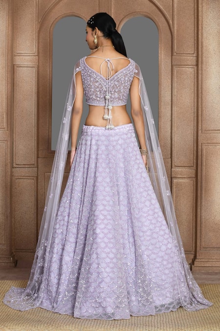 Lilac lehenga featuring all over scallop pattern with tonal cutdana and sequin embroidery. Paired with an off shoulder padded blouse adorned with floral jaal pattern and cape sleeves.