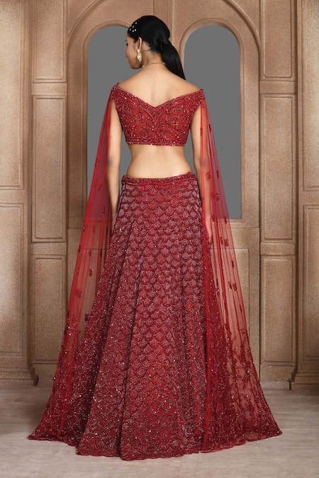 Maroon embroidered lehenga featuring scallop pattern and tonal cutdana & sequin work. Paired with an off shoulder padded blouse with floral jaal embroidery and cape sleeves.