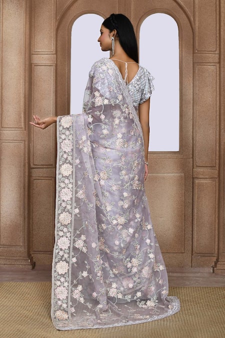 Shop_Kalighata_Purple Organza Sequins, Beads, Cut Work Oomvi Floral Thread Embroidered Saree _Online_at_Aza_Fashions