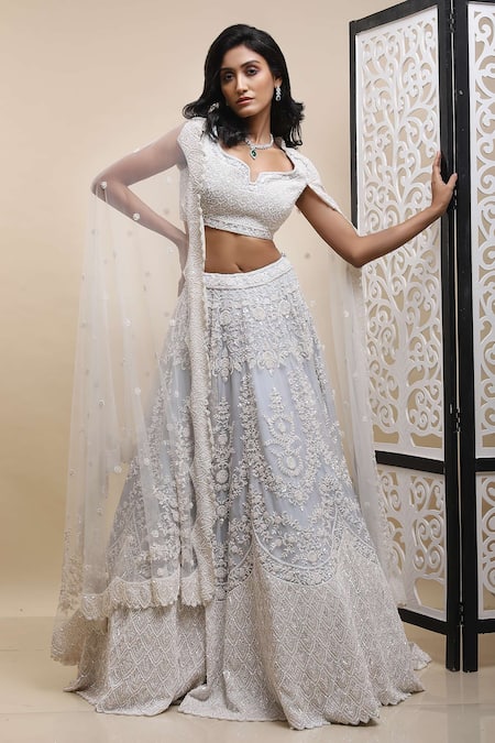 Ice blue lehenga featuring heavily embellished cutdana and sequin work. Paired with a padded blouse and scallop embellished dupatta.