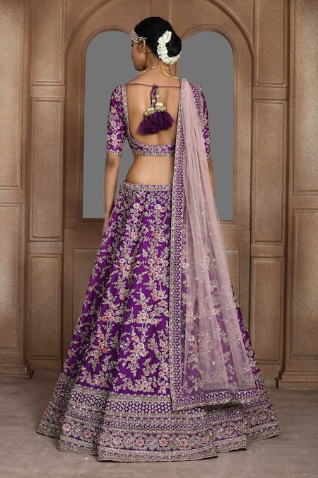Purple raw silk lehenga featuring zari thread and sequin floral embroidery. Paired with a half sleeve padded blouse and an embroidered sheer dupatta.