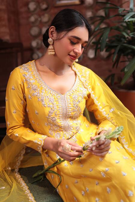 Yellow anarkali featuring zardozi embroidered floral motifs and pearl embellished buttis. Paired with a matching scalloped dupatta that complements the flared silhouette.