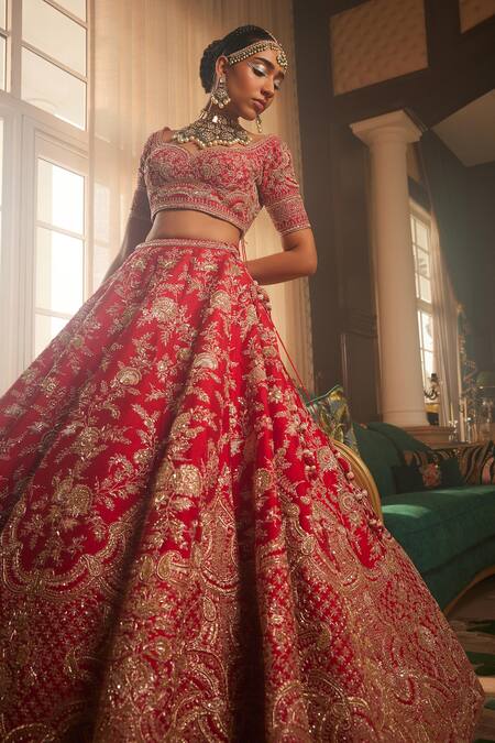 Red Silk, Net Zari, Embroidery, Sequins Persia Cut Dana Bridal Lehenga Set