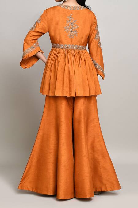 Rust orange silk peplum kurta featuring phool embroidery and three fourth sleeves. Paired with a flared sharara for a complete look.