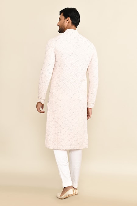 Pink kurta featuring floral Lucknowi embroidery with cutdana and sequins. Paired with ivory pants for a complete set.