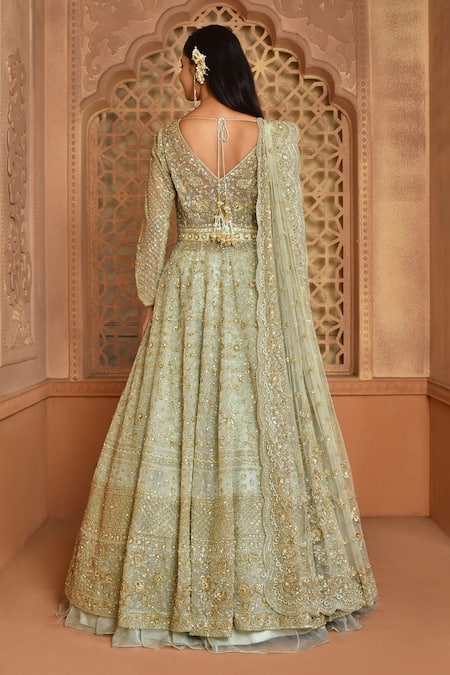 Green lehenga featuring floral embroidery with a padded aqua jacket. Accompanied by an embroidered scallop dupatta with tassel tie-ups.