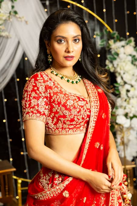 Red lehenga crafted with zardozi work in floral motifs & tassel detail. Paired with floral embroidered blouse & embroidered dupatta.