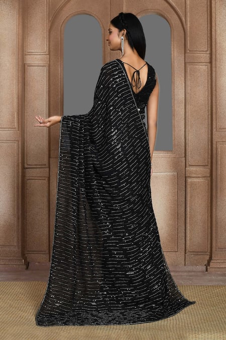 Black organza saree featuring tonal sequin and cutdana embroidery with a striped pattern. Paired with a V neck padded blouse showcasing an all-over leaf pattern embroidery and a deep V back.