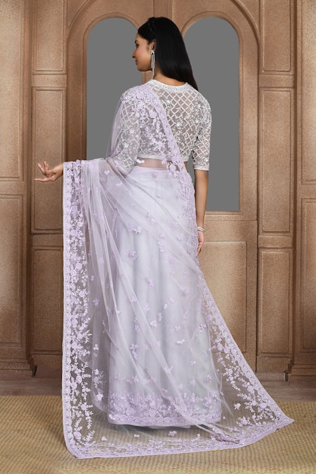 Lilac net saree featuring floral pattern with tonal sequin, cut dana, thread & beads embroidery. Paired with a V neck padded blouse showcasing all over floral checkered pattern embroidery.