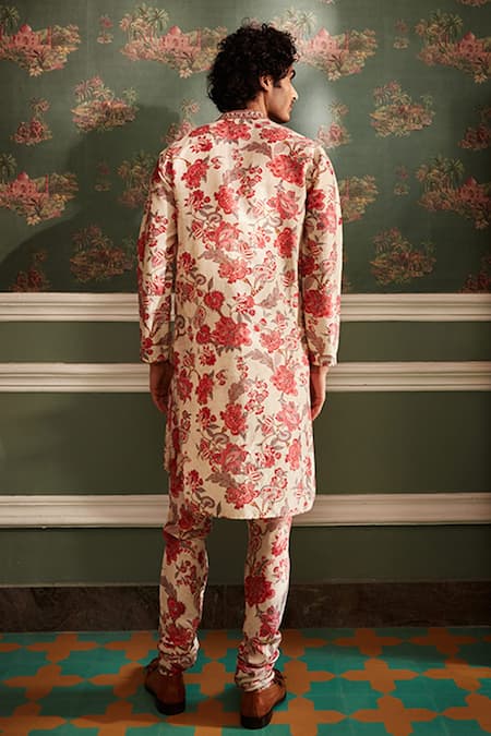 Ivory kurta with chintz print & resham embroidery on placket. Paired with ivory churidar.