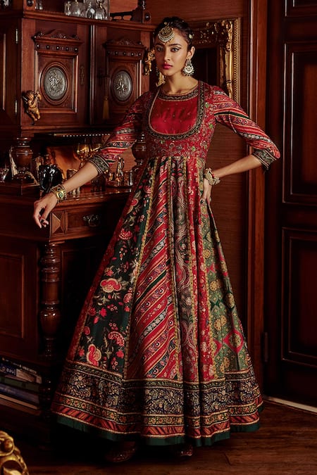 Multicoloured hand painted and printed anarkali with embroidered detail. Paired with a green sheer dupatta.
