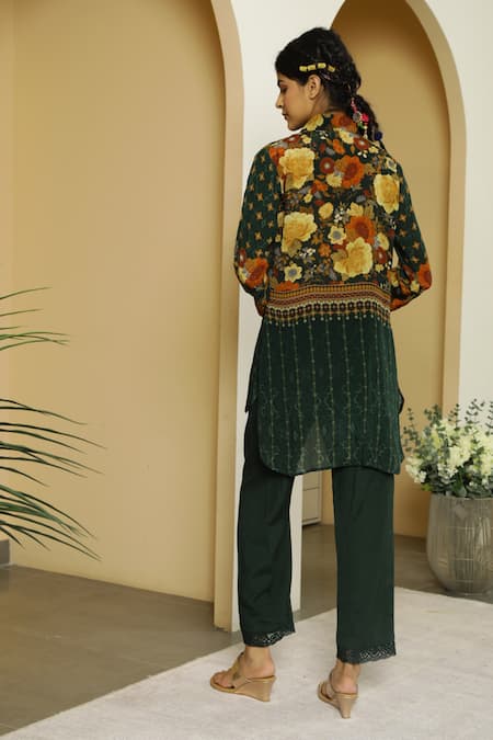 Emerald green tunic featuring geometric & vintage floral design. Paired with straight pant with lace detailing at the bottom.