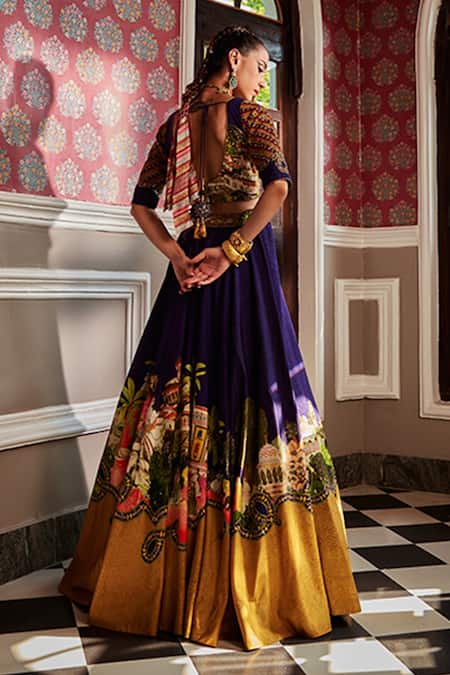 Midnight blue & mustard lehenga with attached cancan & miniature mughal pattern. Comes with intricate hand embroidered padded blouse & embellished dupatta.