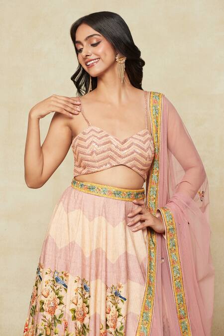 Pink floral lehenga featuring botanic prints and embroidered highlights. Paired with an embroidered blouse and a dupatta.