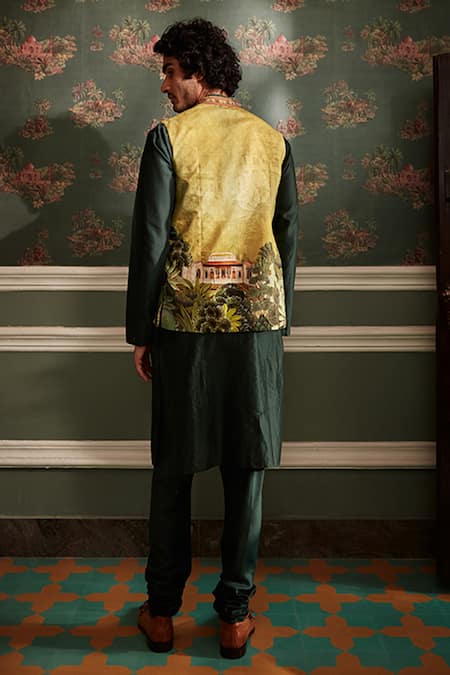 Lime yellow bundi with miniature inspired print & embroidered collar. Paired with chanderi bottle green kurta & chanderi churidar.