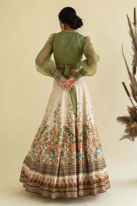 Cream lehenga with floral, bird printed & hand embroidered motifs. Paired with embroidered overlap organza blouse.