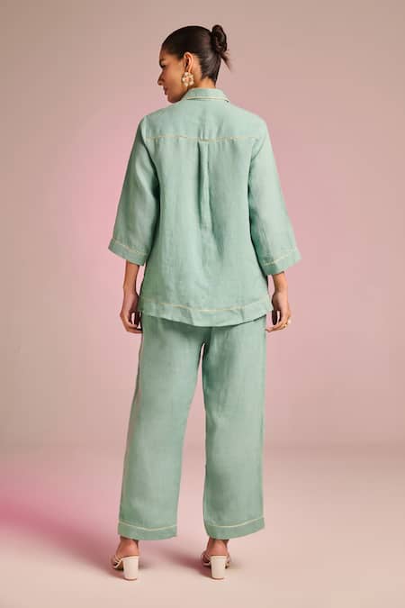 Green Cotton, Linen Embroidery Collared Esha Shirt