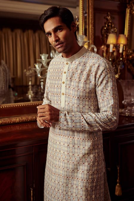 Powder blue kurta with geometric printed motifs & front buttons. Paired with cream churidar.