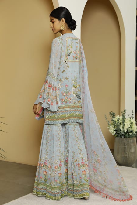 Mint green kurta featuring floral, bird motifs & placement embroidered detail. Paired with floral motif gharara & floral motif dupatta.