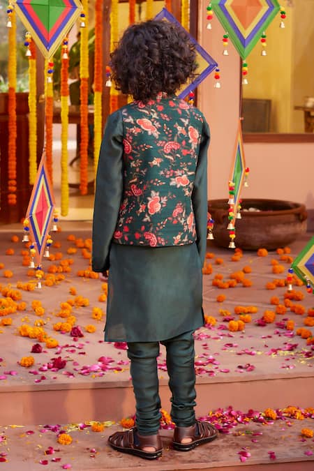 Bottle green floral pattern bundi featuring thread embroidery with a button-down design. The set includes a matching kurta and churidar for a complete look.