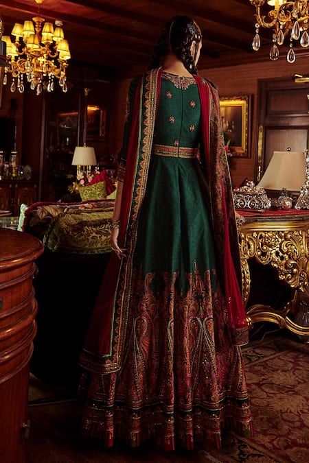 Bottle green embroidered anarkali in floral thread work. Paired with an embroidered dupatta.