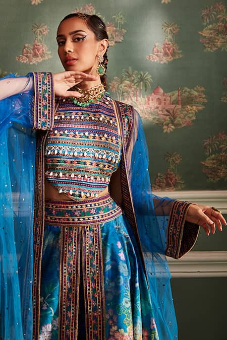 Blue Blouse And Lehenga Skirt Viscose Silk, Mehreen Printed Overlay Palazzo Set