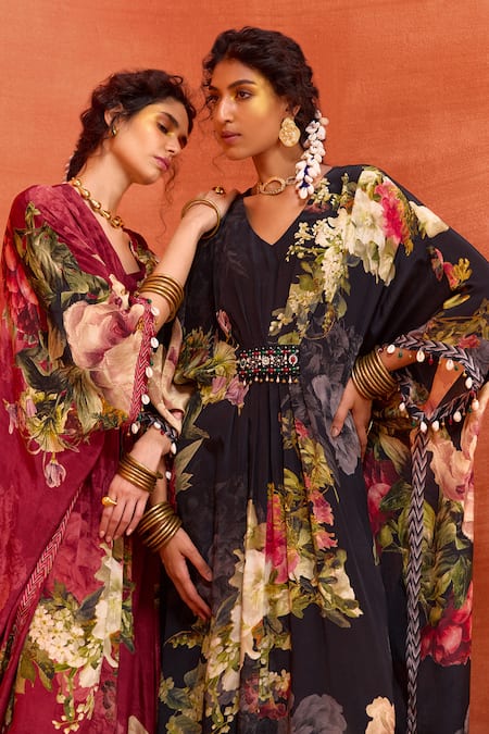 Black kaftan featuring batwing sleeves with all over botanic rose blossom print
