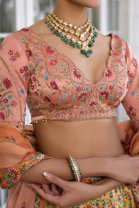 Peach blouse with intricate embroidery and padded design. Paired with a yellow lehenga featuring vibrant floral patterns and a matching peach dupatta.