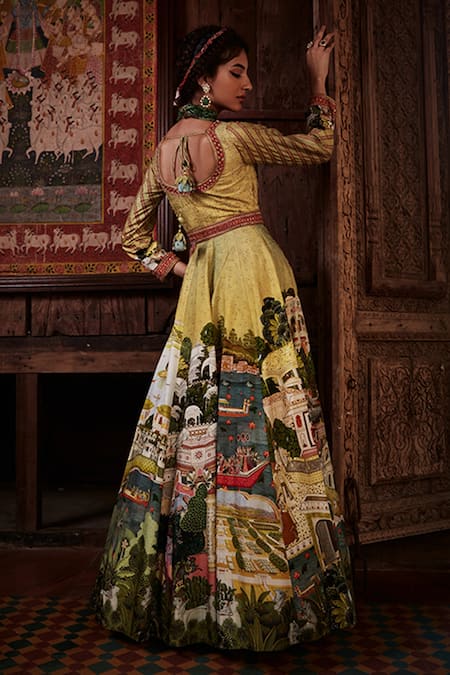Back tie-up, Mughal miniature pattern, Embroidered dupatta, Attached cancan, Attached padding, Attached lining, Approx. Product Weight (in kgs): 4, Note:, Neckpiece worn by the model is not for sale