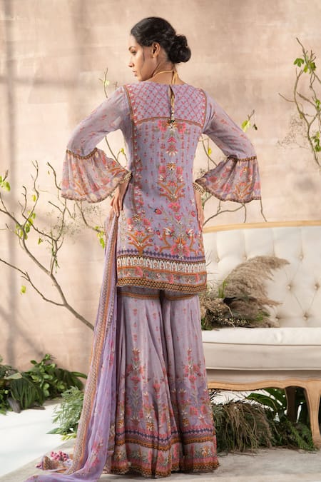 Lilac kurta with all-over floral print, delicate embroidery, round neckline, flared sleeves and straight silhouette. Comes with sharara and dupatta.