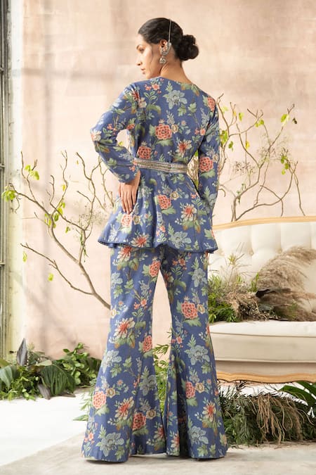 Blue top with all-over floral print, V-neckline, concealed placket and full sleeves. Comes with flared pant and embroidered belt.