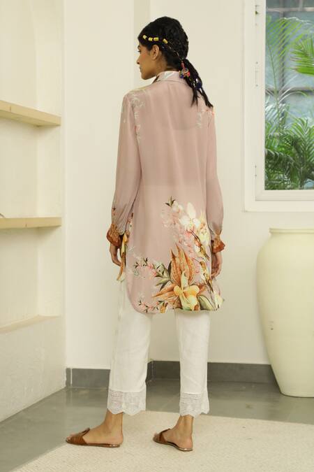 Dusty peach tunic in tropical floral print motifs & frill sleeves. Paired with slim fit, lace detailed straight pant.
