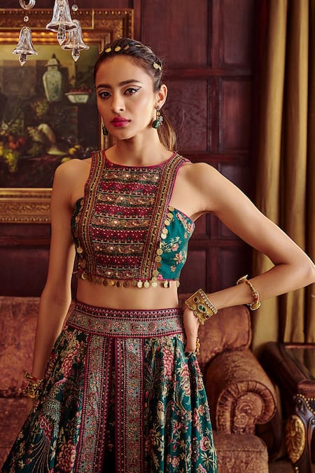 Green Viscose Silk Floral Motifs, Scarlett Printed Overlay Lehenga Palazzo Set