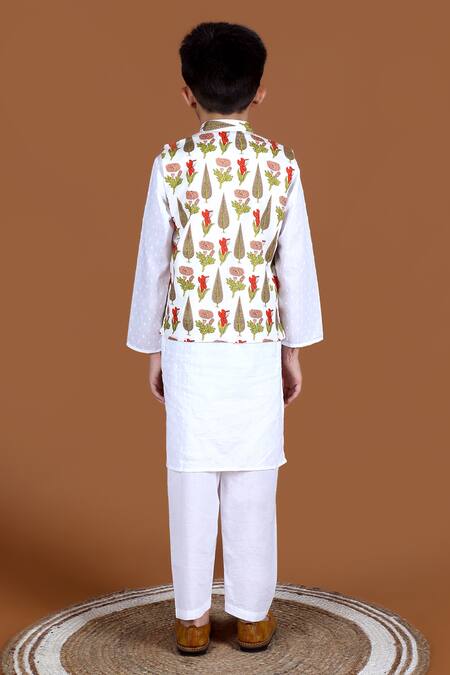 Buy_Kalp_White Cotton Botanical Print Bundi And Kurta Set _at_Aza_Fashions
