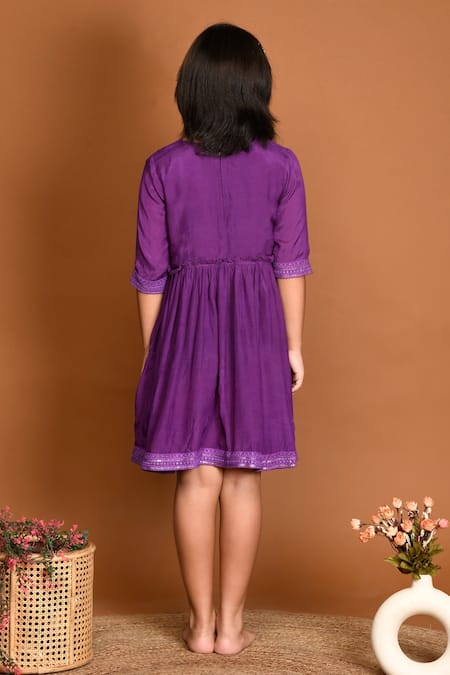 Purple muslin silk gathered dress featuring lace details on the neckline and sleeves