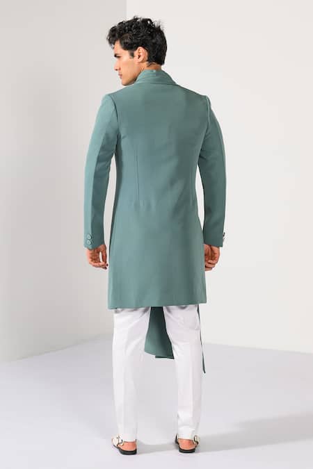 An aqua fade green achkan crafted from teal banana crepe fabric, featuring a draped detail and an attached lining. It is paired with cream slim fit trousers, also made from teal banana crepe, which include a full belt with belt loops, front pockets, and a zipper and metal hook closure with a concealed button.