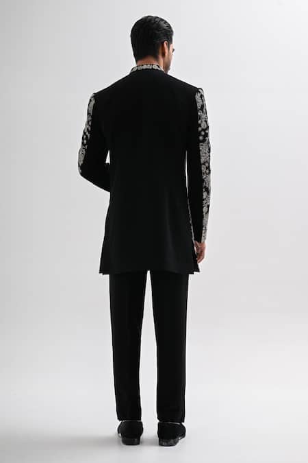 A black Achkan crafted from banana crepe fabric, featuring intricate hand and machine embroidery. It is paired with tailored black trousers that have a full belt with belt loops, front pockets, zipper, and metal hook closure with a concealed button.