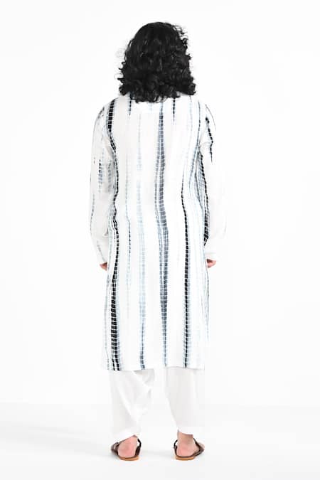 A black and white shibori hand-embroidered kurta crafted from Bamberg raw silk, featuring an attached lining. Paired with a coordinating white salwar made from Bamberg raw silk, which has a full elastic belt closure.