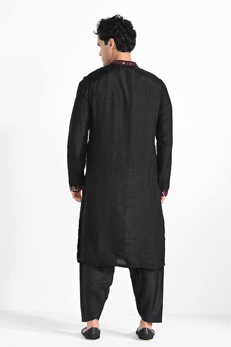 A black Bamberg raw silk kurta features intricate hand and machine embroidery with mirror work on the neckline and cuffs. It is paired with a black Malai cotton pant pajama with a half belt, half elasticated waist, two pockets, zipper, and button closure.