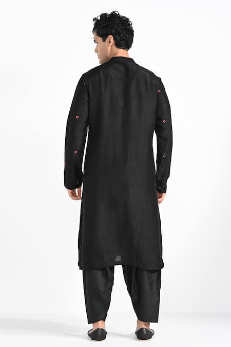 A black kurta crafted from Bamberg raw silk, featuring hand embroidery with red and black poker suit motifs. It is paired with a coordinating black salwar made from Bamberg raw silk, which has a full elastic belt closure.
