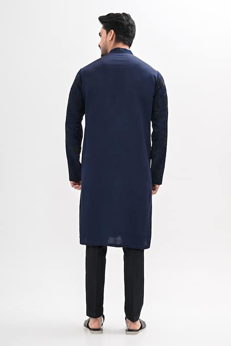 A navy blue kurta crafted from linen satin fabric, featuring intricate hand embroidery and an attached mulmul lining. This ensemble includes a tailored pant pajama with a half belt, half elastic waist, two pockets, and a zipper and button closure. It is paired with an embroidered dupatta.