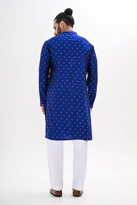 A bright blue kurta crafted from crepe fabric featuring hand and machine embroidery with an attached mulmul lining. It is paired with tailored pant pajamas that have a half belt, half elastic waist, two pockets, and a zipper and button closure.
