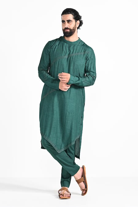 A bottle green hand-embroidered kurta crafted from Bamberg raw silk with an attached lining. It is paired with a coordinating bottle green Malai cotton pant pajama featuring a half belt, half elastic waist, two pockets, and a zipper and button closure.