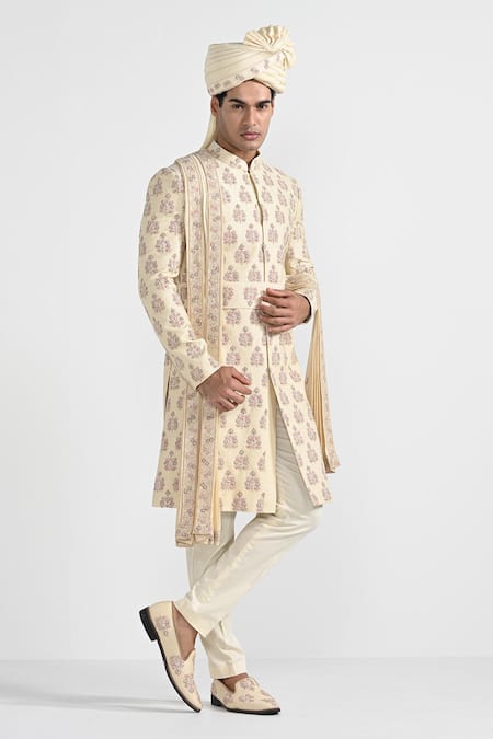 Buy_Kalpana Naik_Cream Bemberg, Silk Embroidery Dark Butta Work Sherwani Set _at_Aza_Fashions