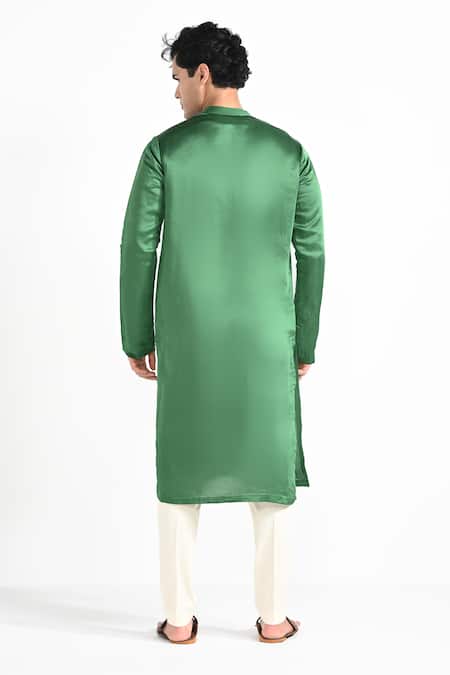 A forest green kurta in linen satin fabric featuring hand embroidery details and an attached lining. It is paired with a buttercream malai cotton pant pajama with a half belt, half elastic waist, two pockets, zipper, and button closure.