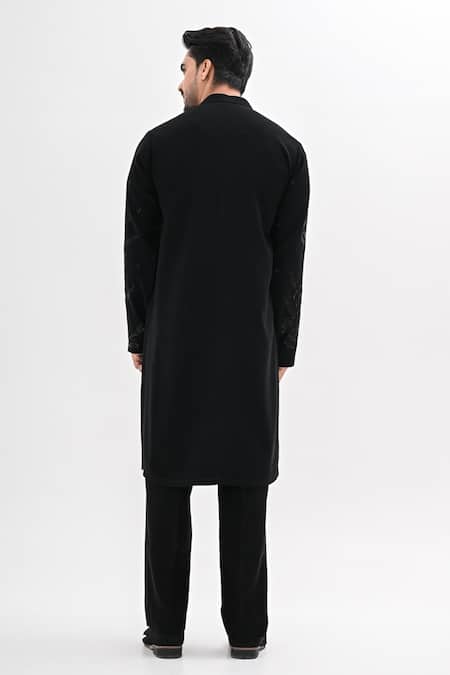 A jet black hand-embroidered kurta crafted from fine banana crepe fabric, featuring an attached lining. It is paired with tailored pant pajamas and a coordinating dupatta.